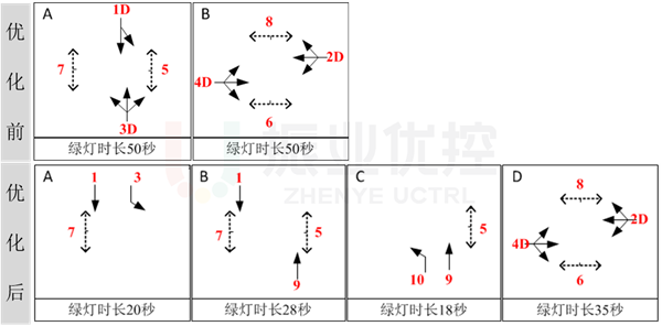 調整相位相序是綠波協(xié)調中比較常見的措施,特別是在道路條件較好、干擾較小,適合做綠波協(xié)調設計的主干道。通過減少支路綠燈空放,主流向相位搭接等方式調配綠信比和相位差,使得車輛能夠一路不停車通過各個路口,減少通行延誤。