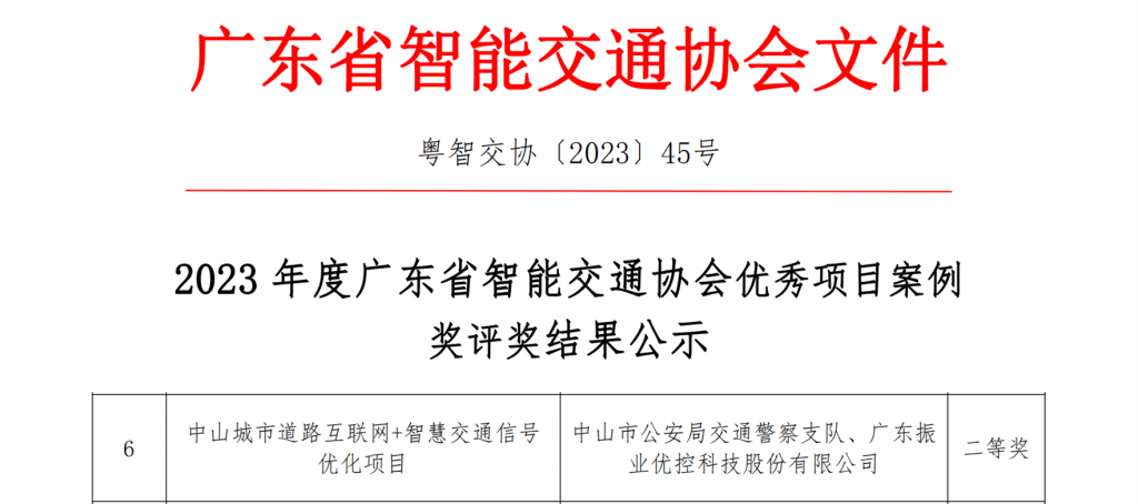 近日,廣東省智能交通協(xié)會(huì)公布了“優(yōu)秀項(xiàng)目案例獎(jiǎng)”獎(jiǎng)項(xiàng)名單,中山市公安局交通警察支隊(duì)與振業(yè)優(yōu)控共同完成的“中山城市道路互聯(lián)網(wǎng)+智慧交通信號(hào)優(yōu)化項(xiàng)目”榮獲二等獎(jiǎng),獲專業(yè)肯定。