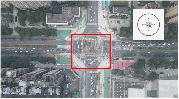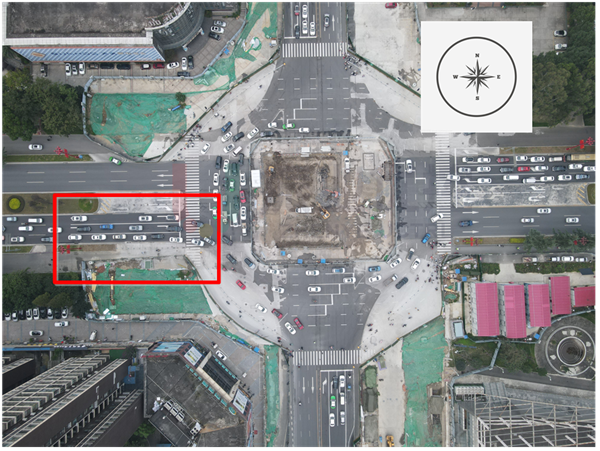 近期,因成眉市域鐵路S5線音樂廣場站建設(shè)需要,眉山大道與文忠街交叉口中間位置及各進口道均存在圍蔽施工區(qū)域;交叉口也配合改造為臨時環(huán)島交叉口,并在各進口道和島內(nèi)分別設(shè)置信號燈,對相應(yīng)的車流進行燈控。