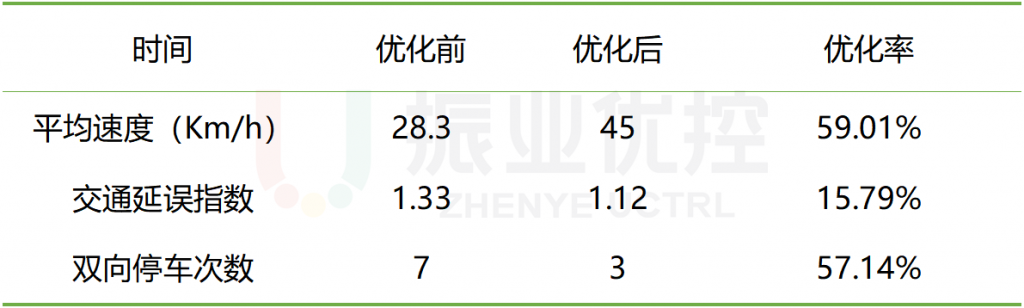 平峰時(shí)段,路段停車次數(shù)由7次減少至0次,路口延誤指數(shù)由1.18下降至1.03,平均行駛速度由35.2km/h提升至60km/h,優(yōu)化率達(dá)70.46%。