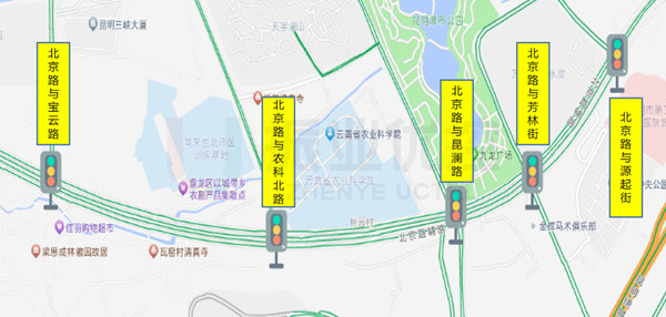 本次優(yōu)化綜合考慮道路通行條件與車流量等因素,針對北京路(寶云路-源起街)沿線各路口間距過短、車流量較大、停車次數(shù)多的問題。