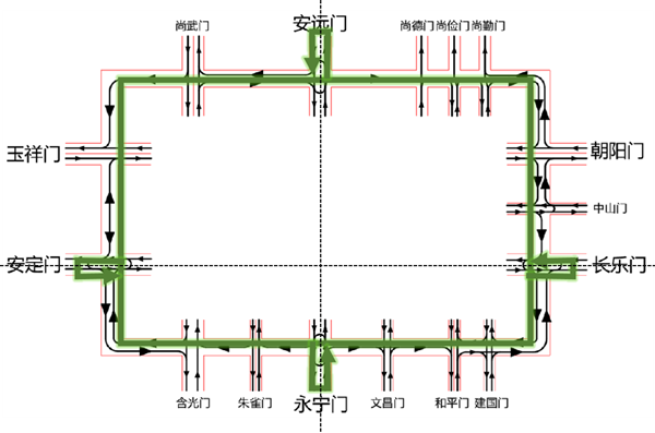 (2)非機(jī)動(dòng)車——“慢行優(yōu)先,通行連續(xù)”打造順城巷騎行環(huán)路。一是在路段保證非機(jī)動(dòng)車通行空間;二是明晰交叉口非機(jī)動(dòng)車通行規(guī)則,主城門(mén)處非機(jī)動(dòng)車逆時(shí)針城外繞行通行(與機(jī)動(dòng)車流線保持一致);三是在其他城門(mén)內(nèi)側(cè)開(kāi)放隔離欄,施劃行人和非機(jī)動(dòng)車過(guò)街設(shè)施。