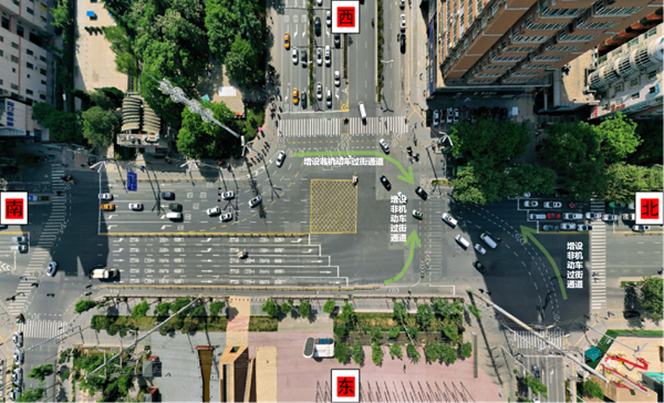 (2)南北進(jìn)口增設(shè)非機(jī)動(dòng)車左轉(zhuǎn)等候區(qū),增設(shè)南北向非機(jī)動(dòng)車左轉(zhuǎn)等候區(qū)及直行過(guò)街通道,明確非機(jī)動(dòng)車通行的空間路權(quán),規(guī)范行車軌跡。