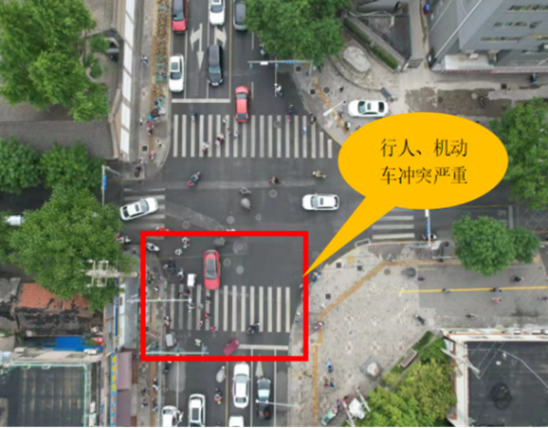 現(xiàn)狀問(wèn)題:周邊學(xué)校眾多,上下學(xué)高峰期交叉口行人、機(jī)動(dòng)車流量巨大。交叉口面積小,許多行人直接穿行交叉口,行人、非機(jī)動(dòng)車、機(jī)動(dòng)車混雜通行,交通秩序混亂,沖突點(diǎn)較多,導(dǎo)致交叉口通行延誤和交通安全隱患較大。