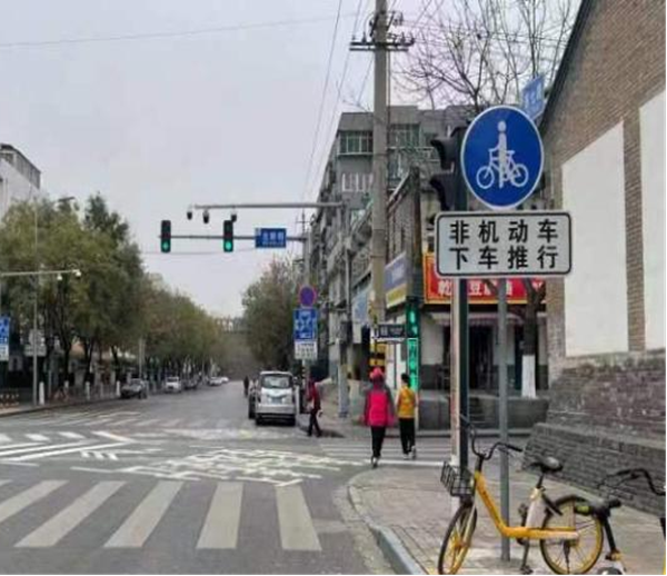 (2)引導(dǎo)非機(jī)動(dòng)車過(guò)街“下車推行”,增設(shè)非機(jī)動(dòng)車下車推行指示標(biāo)志和輔助標(biāo)志。