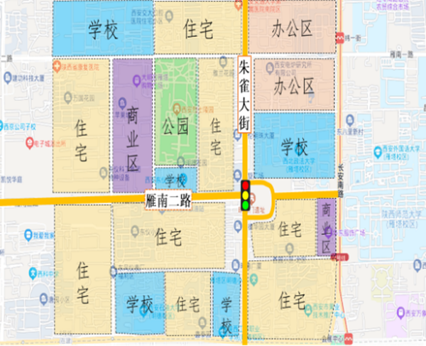 路口概況:朱雀大街與雁南二路交叉口是雁塔區(qū)南北主干道上一個(gè)重要交通節(jié)點(diǎn),受明德門(mén)遺址保護(hù)區(qū)的影響,該交叉口采取環(huán)島交通組織形式,并形成3個(gè)“T”型交叉口組合,交叉口渠化較為復(fù)雜。此外,因交叉口周邊住宅、商業(yè)、學(xué)校、醫(yī)院等交通吸引點(diǎn)分布密集,在高峰時(shí)段,行人、非機(jī)動(dòng)車流量大。