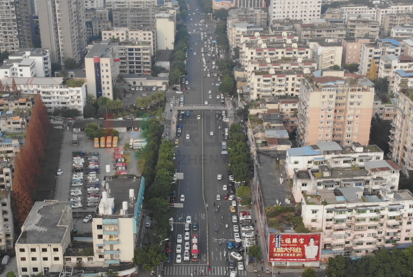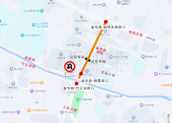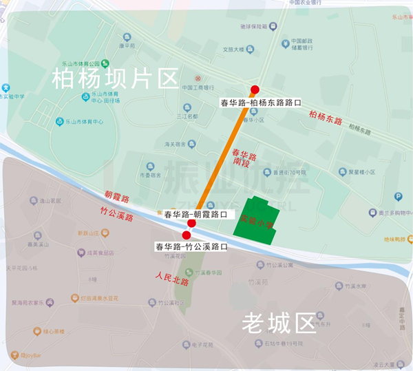 春華路是連接柏楊壩片區(qū)與老城區(qū)的重要道路,高峰期南段過(guò)境通勤交通流壓力較大。樂(lè)山市實(shí)驗(yàn)小學(xué)位于柏楊壩片區(qū)春華路南段東側(cè),路段上下學(xué)接送需求大,過(guò)境通勤與接送車流重疊導(dǎo)致路段高峰期擁堵較為嚴(yán)重。