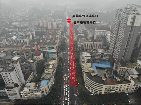 高峰時(shí)段,對(duì)相鄰的北邊春華路-柏楊東路路口、南邊春華路-竹公溪路口的信控方案進(jìn)行同步調(diào)整,加快節(jié)點(diǎn)春華路-朝霞路路口車流疏散。
