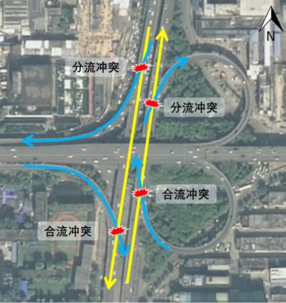 問題簡述:全線高架段與地面段車道數(shù)不匹配,位階差較大,沿線進(jìn)出口較多,車流流向構(gòu)成復(fù)雜,車輛分合流、頻繁變道通行,易造成行車延誤和碰擦等輕微交通事故,加之車流量較大,高峰時(shí)段交通擁堵頻發(fā)。