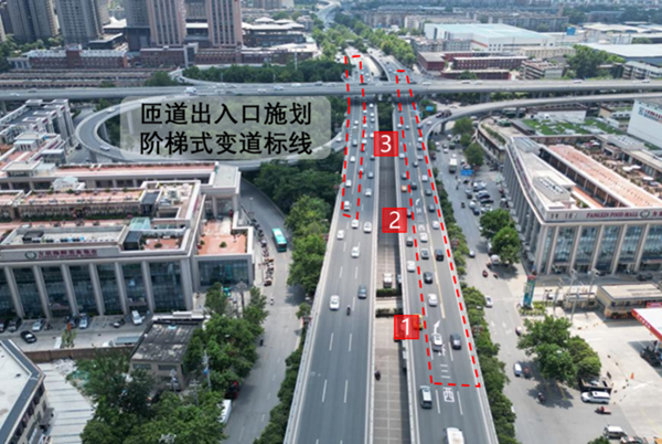優(yōu)化措施:應(yīng)用階梯式變道交通組織模式。施劃地面文字標(biāo)識(shí)、增設(shè)車道級指路標(biāo)志,加強(qiáng)引導(dǎo)需駛離車輛在駛出匝道上游提前變道;施劃虛實(shí)線,用于駛離車輛向右變道合流;施劃長實(shí)線,規(guī)范匝道口行車秩序,防止車輛隨意變道引發(fā)交通事故;增設(shè)電子抓拍警告設(shè)備,對不按規(guī)定車道行駛等違法行為進(jìn)行短信警示教育,讓車流由無序變?yōu)橛行颉?/p>