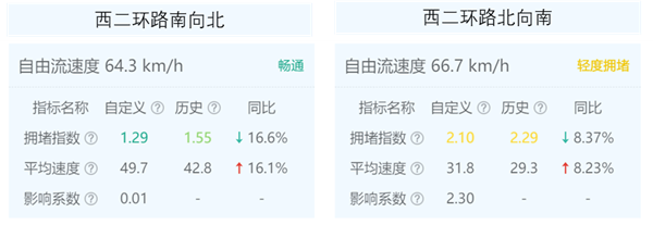 優(yōu)化效果:新型交通組織模式實(shí)施后,西二環(huán)主線南向北擁堵指數(shù)下降16.6%,平均速度提升16.1%;北向南擁堵指數(shù)下降8.37%,平均速度提高8.23%,交通事故率減少3%。