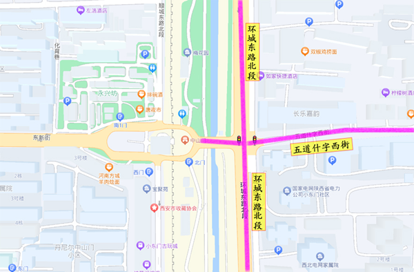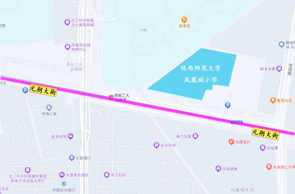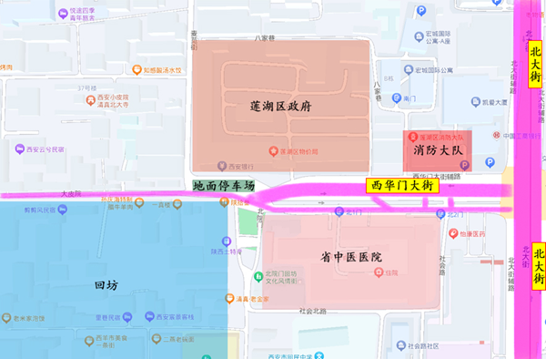 概況:西華門大街(北大街至麥莧街段)道路南側(cè)為陜西省中醫(yī)醫(yī)院,北側(cè)為蓮湖區(qū)人民政府、蓮湖區(qū)消防大隊(duì),西側(cè)為回坊美食文化街區(qū)。