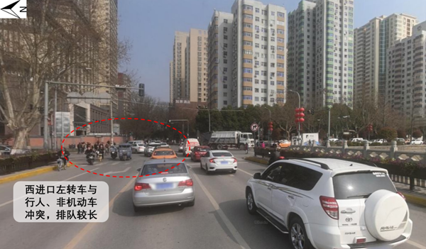 問題簡述:東進(jìn)口雙向2車道,左轉(zhuǎn)和直行相位無法分設(shè),東西向左轉(zhuǎn)車輛與行人沖突較大,存在排隊(duì)溢出現(xiàn)象。