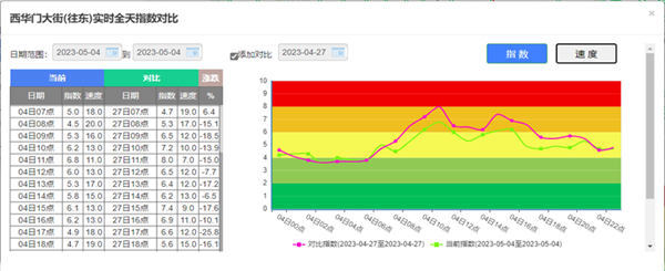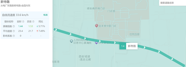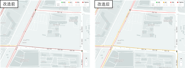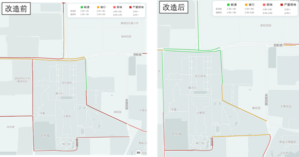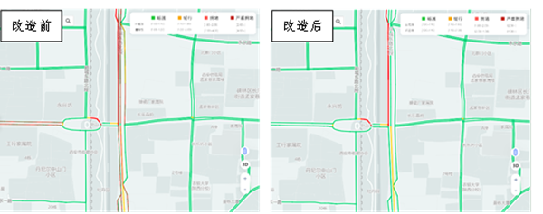 優(yōu)化效果:通過區(qū)域微循環(huán)改造,新寺路設(shè)置由西向東單行路的措施,唐都醫(yī)院門前就醫(yī)高峰期平均擁堵指數(shù)下降5.71%,平均運(yùn)行速度上升7.49%,緩堵效果明顯。