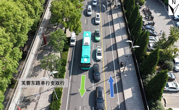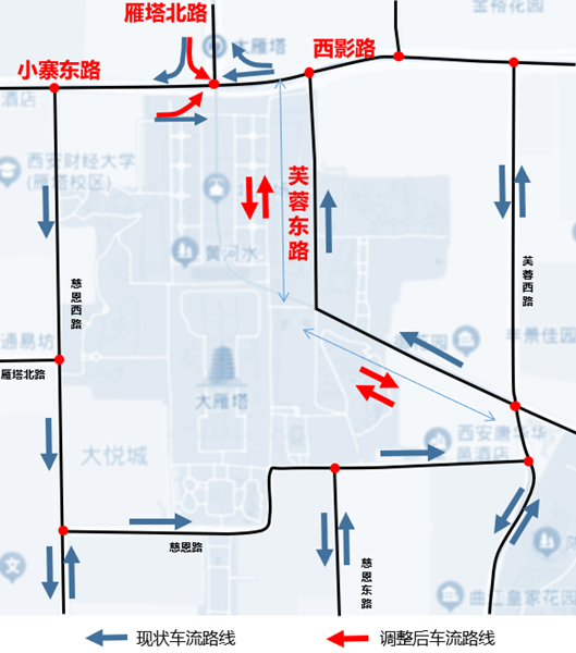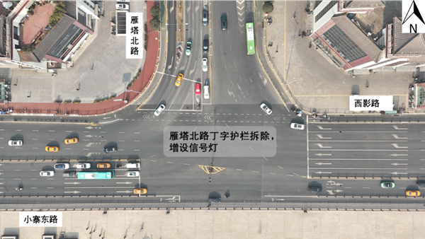 優(yōu)化措施:芙蓉東路(芙蓉西路至西影路段)由南向北單行調(diào)整為雙向行駛,拆除大雁塔北廣場丁字原封閉護(hù)欄,并增設(shè)交通信號(hào)燈,完善路口轉(zhuǎn)向功能。
