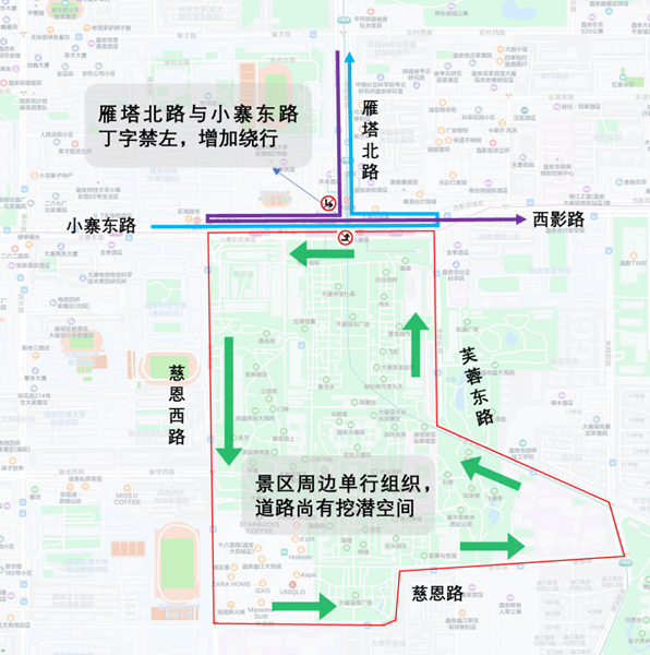 概況:大雁塔作為古城地標(biāo)性建筑,雙休日、節(jié)假日期間周邊路網(wǎng)中慈恩西路、小寨東路、雁塔北路、西影路、芙蓉東路等道路通行壓力極大。