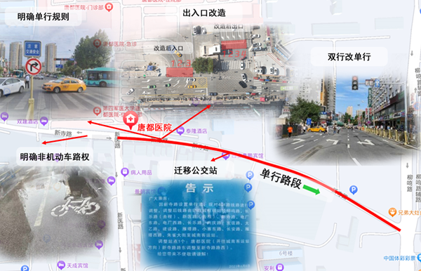 優(yōu)化措施:新寺路(新醫(yī)路至柳鳴路段)由雙向行駛調(diào)整為由西向東單行,施劃雙向非機(jī)動(dòng)車通道、增設(shè)非機(jī)動(dòng)車交通信號(hào)燈保障慢行交通通行路權(quán),對調(diào)醫(yī)院停車場出入口,同步調(diào)整院內(nèi)交通組織,遷移部分公交站點(diǎn)。