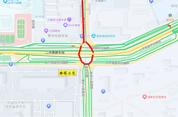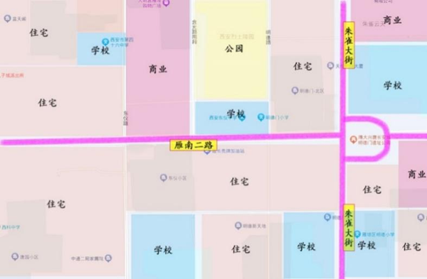 概況:雁南二路為東西向快速路,朱雀大街為南北向主干道,兩條道路相交于明德門遺址公園西側(cè),路口周邊寫字樓、住宅區(qū)、商業(yè)體林立,通過性與集散性交通流疊加。