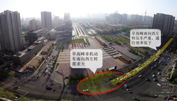 問題簡述:受遺址保護(hù)區(qū)影響,路口采用單向環(huán)島形式,高峰時(shí)段交通壓力極大,中央二次待行區(qū)車流交織嚴(yán)重,溢出問題頻發(fā)。