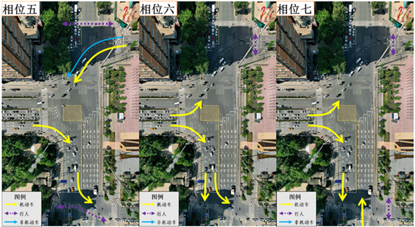 2.信控配時(shí)精細(xì)化:增加南向西左轉(zhuǎn)、東向西直行非機(jī)動(dòng)車專用放行相位,南向西左轉(zhuǎn)車流設(shè)置二次放行模式清空中央二次待行區(qū)排隊(duì)車輛,同時(shí)根據(jù)路口不同時(shí)段的交通特性重新細(xì)化時(shí)段,提升信號(hào)配時(shí)與交通流量的匹配度。