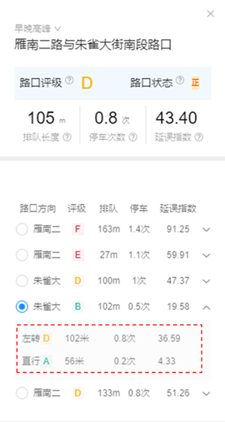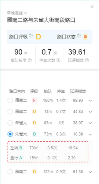 優(yōu)化效果:優(yōu)化后路口整體排隊(duì)長度由105米縮短至90米(降幅14.28%),平均延誤指數(shù)下降8.73%。其中南向西左轉(zhuǎn)方向優(yōu)化效果最為明顯,健康評級由等級D提升到B級,排隊(duì)長度由102米下降至73米(降幅28.43%),平均延誤指數(shù)下降45.50%。