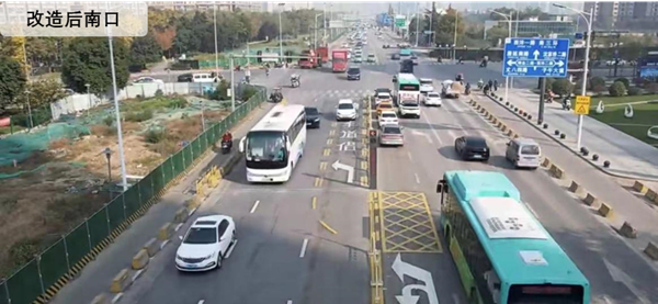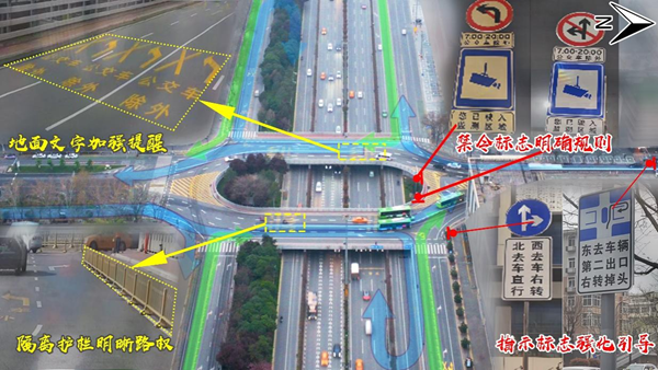 1.上橋匝道由單行調(diào)整為雙行通行,盤道內(nèi)東西向禁左禁直、南北向禁左(7時(shí)至20時(shí),公交車除外);增設(shè)機(jī)非隔離護(hù)欄,分離機(jī)非混行沖突。
