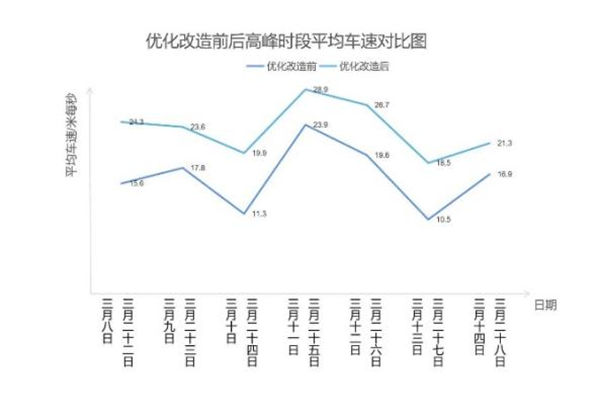 優(yōu)化效果:雙休日、節(jié)假日期間片區(qū)路網(wǎng)擁堵指數(shù)下降26.9%,擁堵時(shí)長縮短16.98%,平均車速提升31.4%。