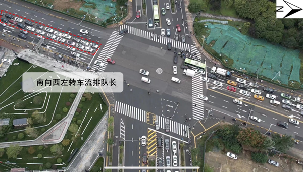 問題簡述:工作日早晚高峰路口南向西左轉(zhuǎn)車流通行需求極大,排隊(duì)溢出至上游路口問題頻發(fā)。