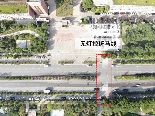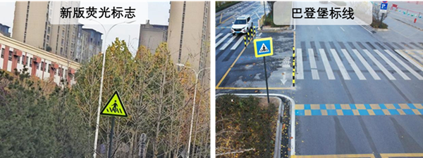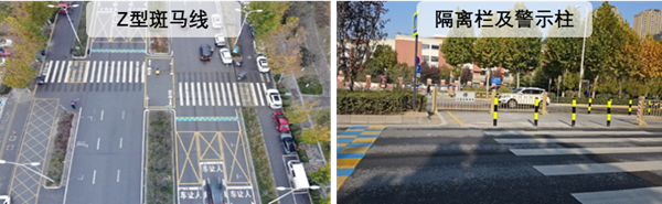優(yōu)化措施:設(shè)置“Z”字型斑馬線及“階梯式”停止線保障人、車安全視距,施劃“巴登堡紋”標(biāo)線增強(qiáng)斑馬線警示效果,增設(shè)熒光黃綠新型交通標(biāo)志及警示柱提升夜間視認(rèn)性。