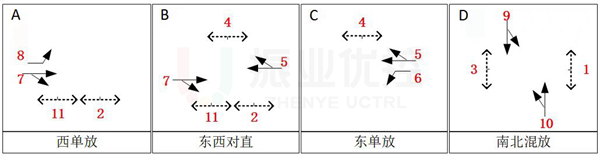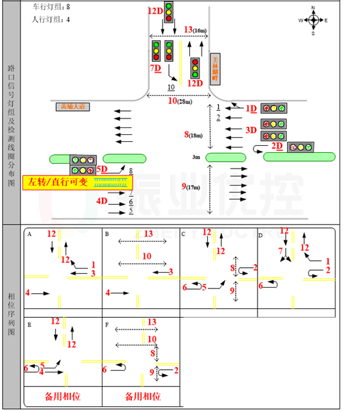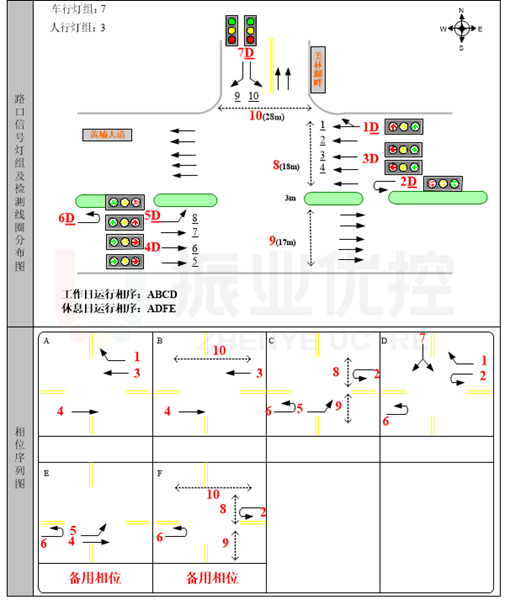 (2)時(shí)間上,一是高峰時(shí)段放行結(jié)構(gòu)改為“西單邊、東單邊、北左轉(zhuǎn)提前、北單邊、南左轉(zhuǎn)提前、南單邊”放行,改善路口通行秩序;平峰時(shí)段仍保留“東西左轉(zhuǎn)提前、東西對向全放、北左轉(zhuǎn)提前、北單邊、南左轉(zhuǎn)提前、南單邊”放行,提高路口整體通行效率,減少停車延誤。二是設(shè)置感應(yīng)控制方案,根據(jù)現(xiàn)場車流變化情況調(diào)整各相位綠燈時(shí)間,減少綠燈空放現(xiàn)象,改善出行體驗(yàn)。