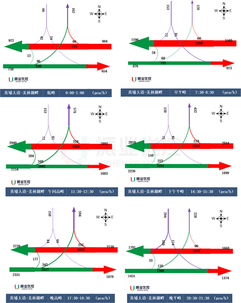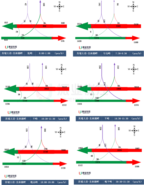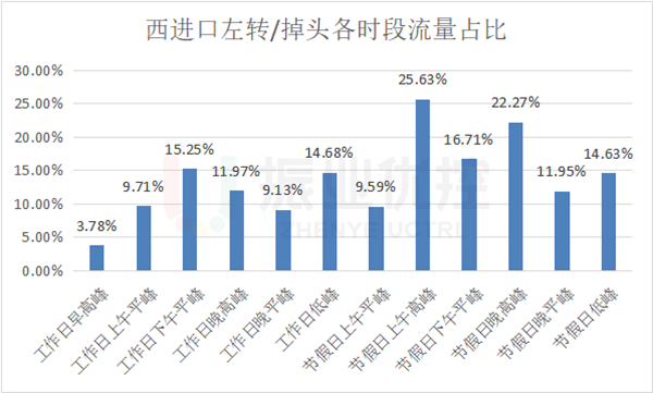 路口西進(jìn)口掉頭、左轉(zhuǎn)、直行,東進(jìn)口直行,北進(jìn)口左轉(zhuǎn)、右轉(zhuǎn)等關(guān)鍵流向流量情況統(tǒng)計(jì)如下圖5、圖6,呈現(xiàn)以下特點(diǎn):