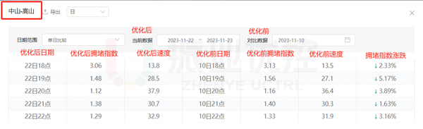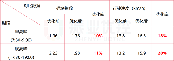 優(yōu)化效果:雙休日、節(jié)假日期間片區(qū)路網(wǎng)擁堵指數(shù)下降26.9%,擁堵時(shí)長縮短16.98%,平均車速提升31.4%。