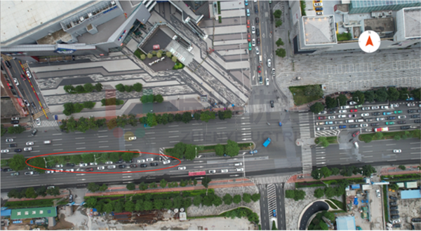 問題簡述:工作日早晚高峰路口南向西左轉(zhuǎn)車流通行需求極大,排隊(duì)溢出至上游路口問題頻發(fā)。