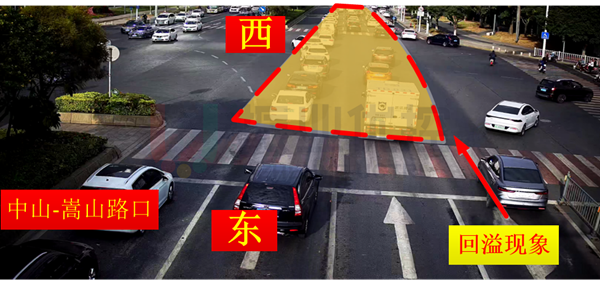 下游中山-衡山路口距離中山-嵩山路口較近,路段蓄車空間有限,高峰時(shí)段中山-衡山路口東往西方向車流頻繁回溢至中山-嵩山路口西出口,影響中山-嵩山路口通行效率。