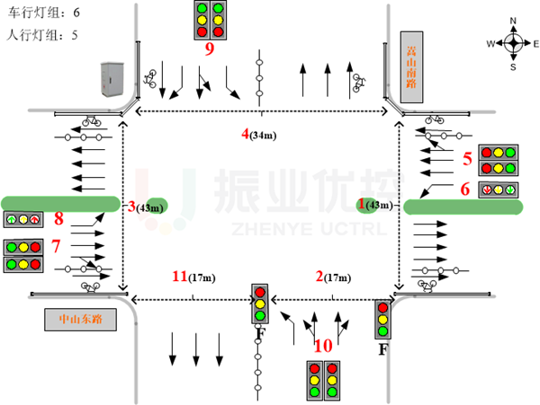 針對路口存在問題,從兩個(gè)方面進(jìn)行優(yōu)化。一方面,相序優(yōu)化,通過調(diào)整路口放行方式,減少南北混放帶來的行駛沖突,消除安全隱患。另一方面,外截內(nèi)疏,均衡中山-嵩山路口東側(cè)路口的車流,控制早晚高峰進(jìn)入中山-嵩山路口東進(jìn)口的車流量。